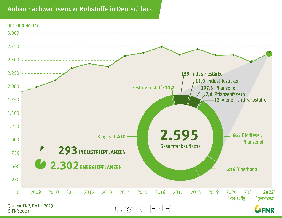 Die Anbaufläche für nachwachsende Rohstoffe ist 2022 gegenüber dem Vorjahr angestiegen, auf lange Sicht aber konstant. Die größte Bedeutung haben Energiepflanzen für Biogasanlagen.