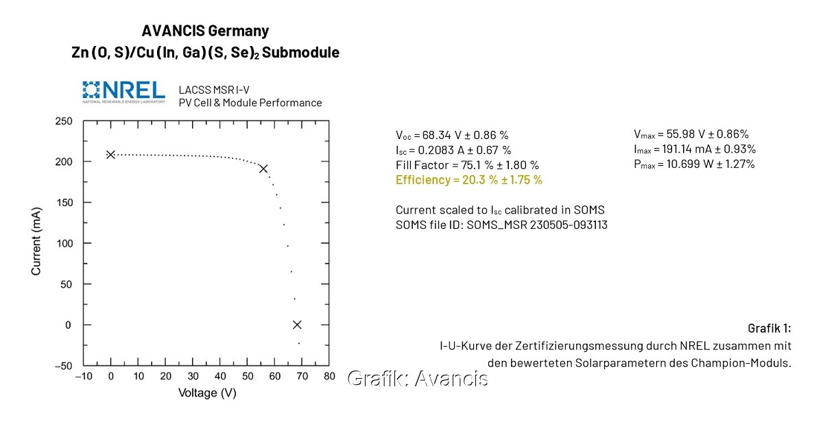 Die CIGS-Technologie von Avancis hat einen Wirkungsgrad von 20,3 % auf der Aperturfläche erreicht. Zertifiziert wurde der Wirkungsgrad vom National Renewable Energy Lab.