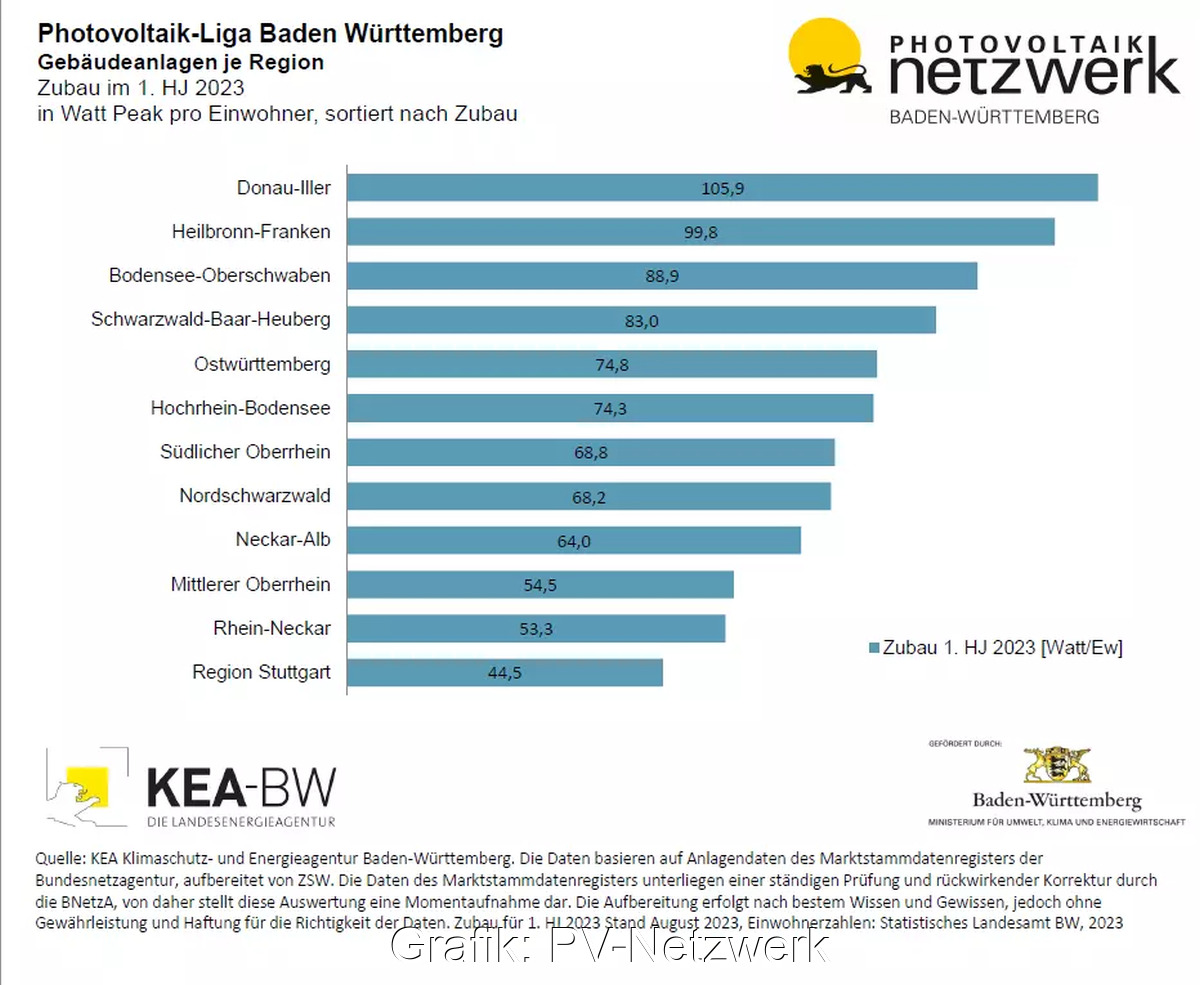 Rekord für das Ländle: noch nie hat das Bundesland so viel PV zugebaut wie im ersten Halbjahr 2023. Vor allem im Osten boomt die Technologie.