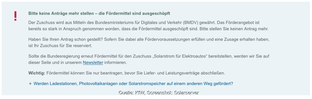 Schon vor Ablauf des ersten Tages waren die Fördermittel im KfW-Programm für Solar-Wallbox-Kombinationen erschöpft.