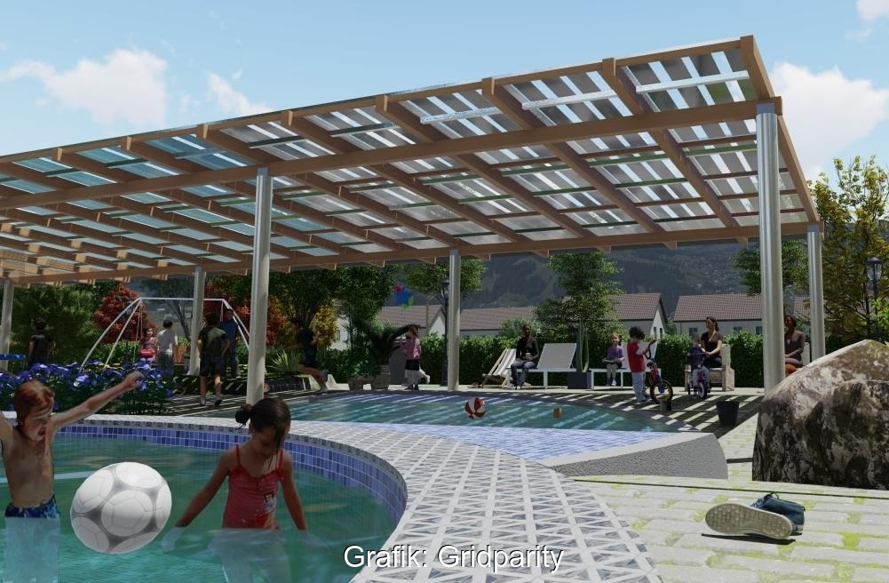 Photovoltaik-Anlagen können nicht nur als Parkplatzüberdachung für Schwimmbäder dienen, sie können auch durch verschattete Bereiche das Schwimmbad selbst aufwerten.
