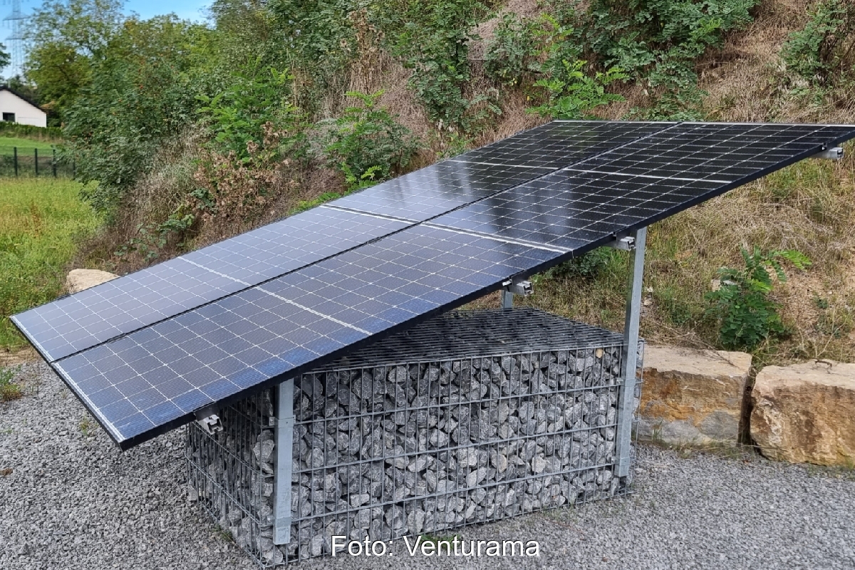Venturama Solar hat mit Steinen gefüllte Gabionen als Unterkonstruktion für PV-Anlagen entwickelt. Sie bieten eine Option für Installationen im anspruchsvollen Gelände.