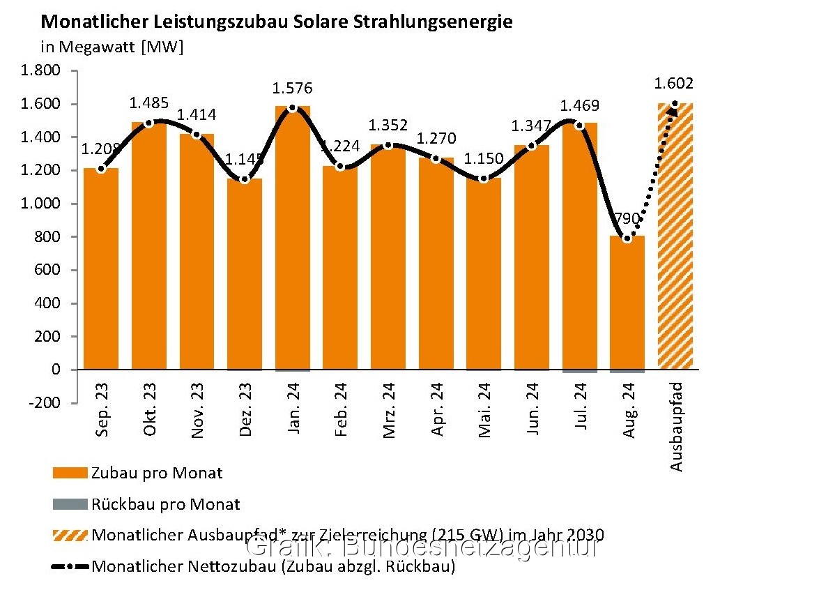 Laut den vorläufigen Zahlen der Bundesnetzagentur wurden im August Photovoltaik-Anlagen mit einer Leistung von 790 MW neu in Betrieb genommen. Das ist im Vergleich zum Vormonat fast eine Halbierung.