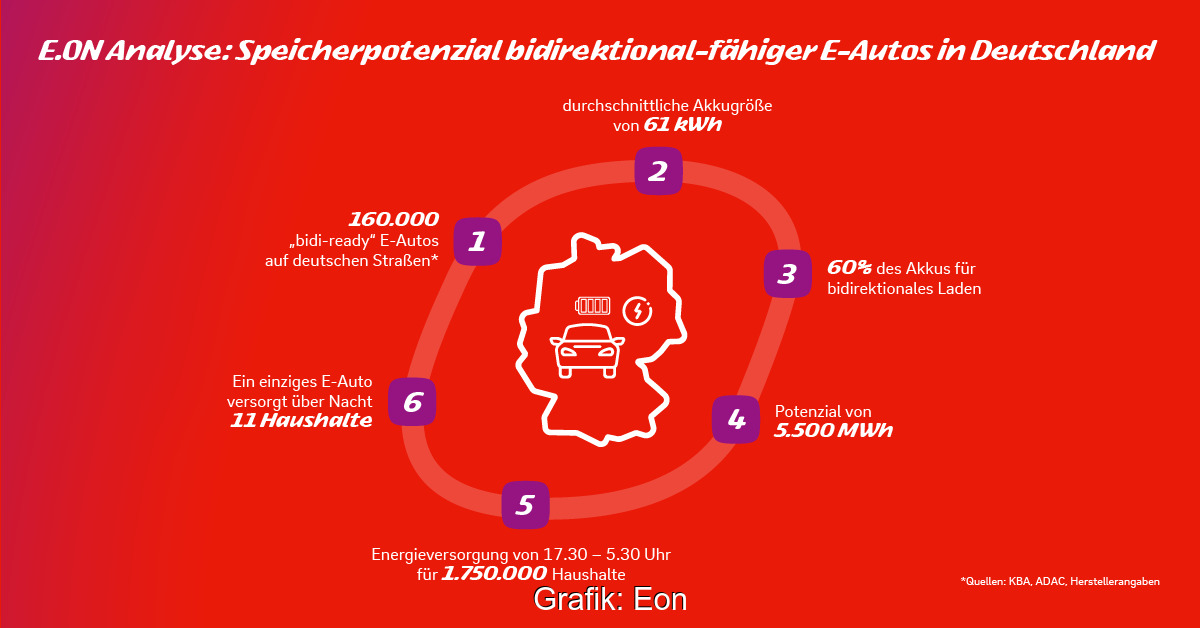 Theoretisch könnte heute schon die heimische E-Auto-Flotte durch bidirektionales Laden als relevanter Stromspeicher fungieren. Laut einer Eon-Analyse könnten die Fahrzeuge aktuell rund 5.500 MWh zur Verfügung stellen.
