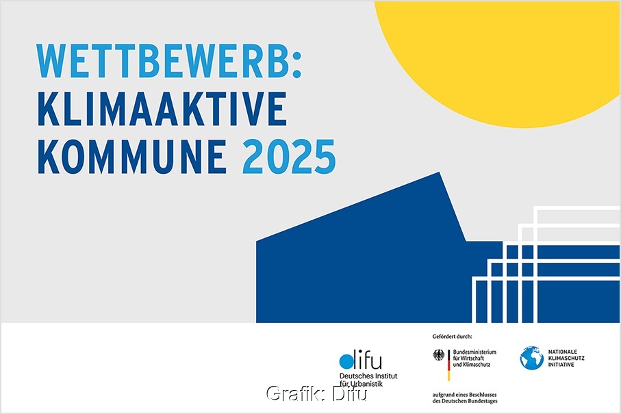 Beim Wettbewerb "Klimaaktive Kommune" zeichnet das Difu erfolgreich realisierte, wirkungsvolle und innovative Klimaschutzprojekte aus. Kommunen aus dem gesamten Bundesgebiet können sich bewerben und je 40.000 Euro Preisgeld für weitere Klimaschutzmaßnahmen gewinnen.