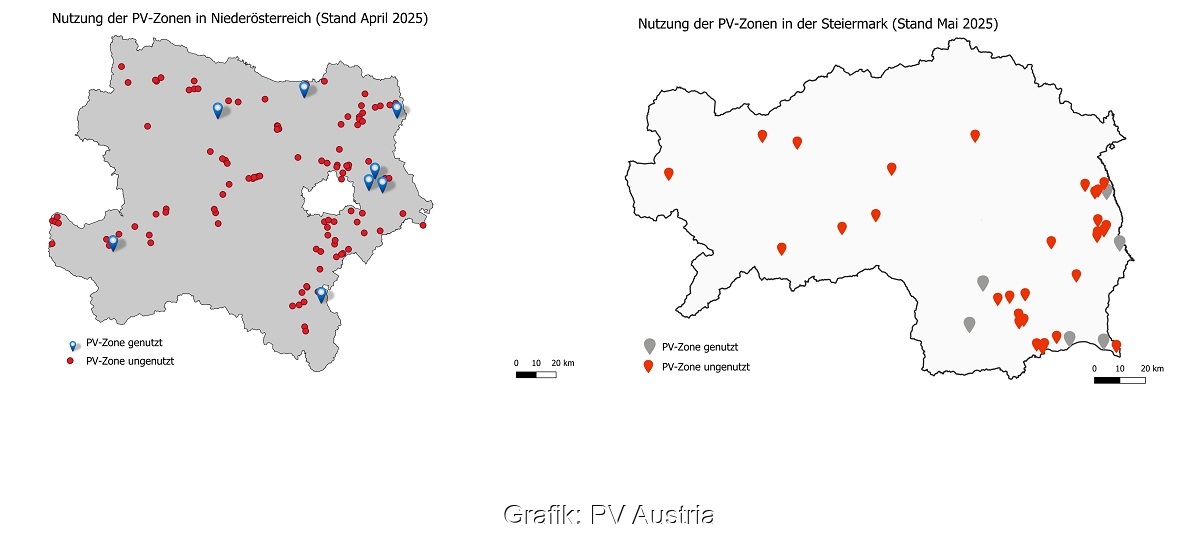 In der Steiermark hat man in den 36 ausgewiesenen Vorrangzonen für PV-Freiflächenprojekte bislang sechs Solarkraftwerke errichtet. In Niederösterreich sind es acht von 116. Andere Bundesländer haben erst gar keine PV-Vorrangzonen eingerichtet, kritisiert der Verband PV Austria.
