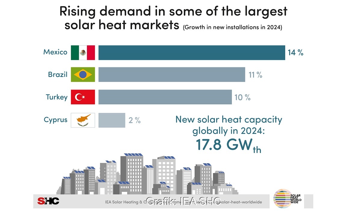 Das IEA Solar Heating and Cooling Programm (IEA SHC) hat den Bericht Solar Heat Worldwide Edition 2025 vorgelegt. Im Jahr 2024 führte China den globalen Markt für industrielle Solarwärme an, während die Niederlande den höchsten Zuwachs an neu installierter solarer Fernwärmeleistung in Europa verzeichneten. In Deutschland wurden die meisten PVT-Kollektoren installiert.