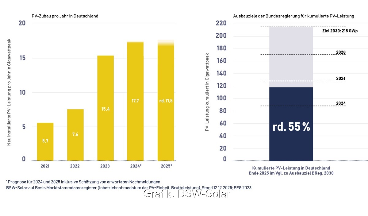 Im Jahr 2025 sind rund 17,5 Gigawatt Photovoltaik-Leistung in Deutschland neu installiert worden. Das ist verglichen mit 2024, als 17,7 GW installiert wurden, ein leichter Rückgang des Photovoltaik-Marktes. Der Branchenverband BSW-Solar appelliert an die Bundesregierung die Rahmenbedingungen für die PV-Branche nicht zu verschlechtern.