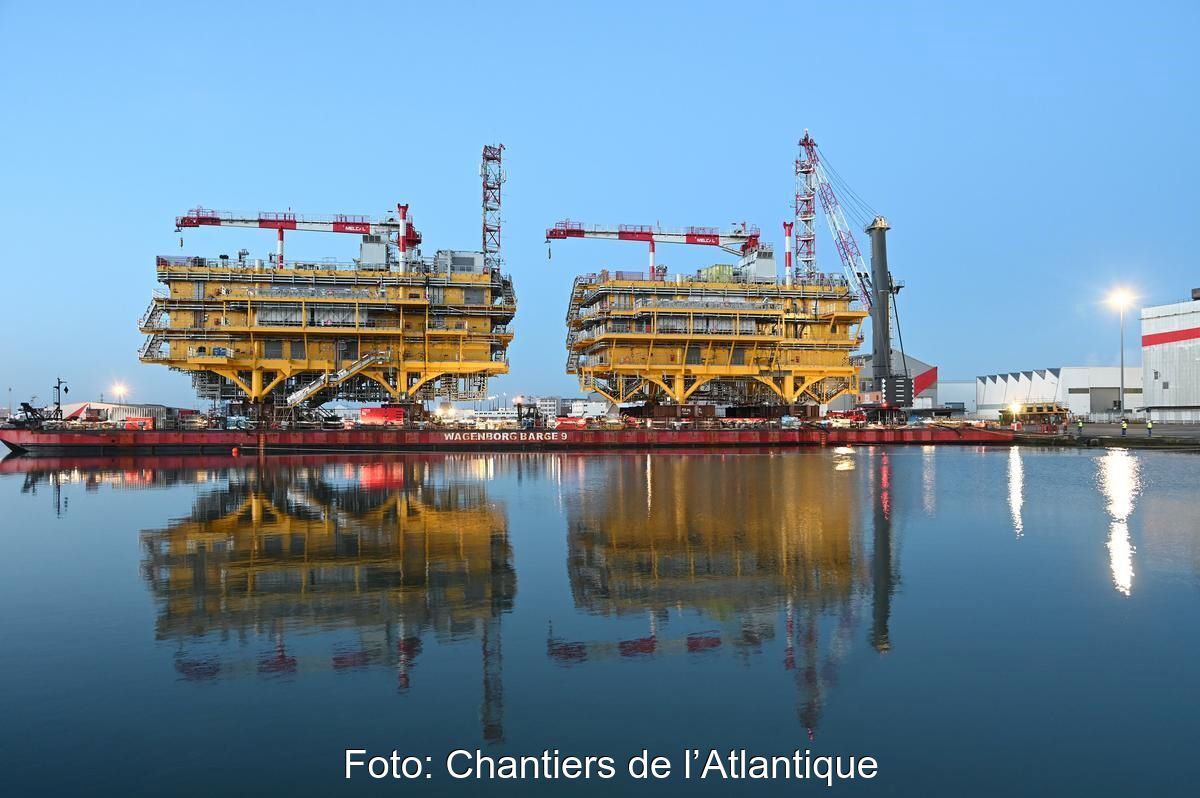 Die französische Werft Chantiers de l’Atlantique hat die beiden Umspannwerke für den Offshore-Windpark Nordseecluster A von RWE fertiggestellt. In den kommenden Wochen sollen sie vor der Insel Juist installiert werden.